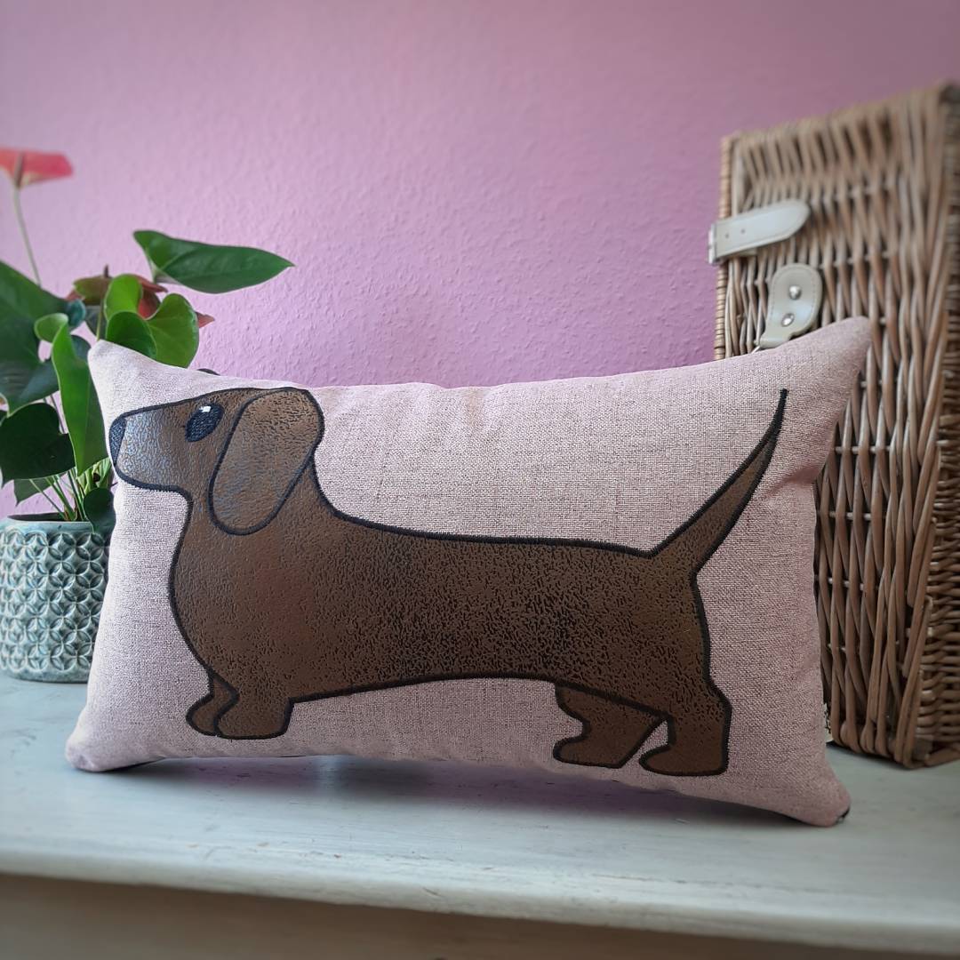 Das nachhaltig gefertigte DackelKissen wird inklusive Füllung zu Dir nach Hause geliefert.