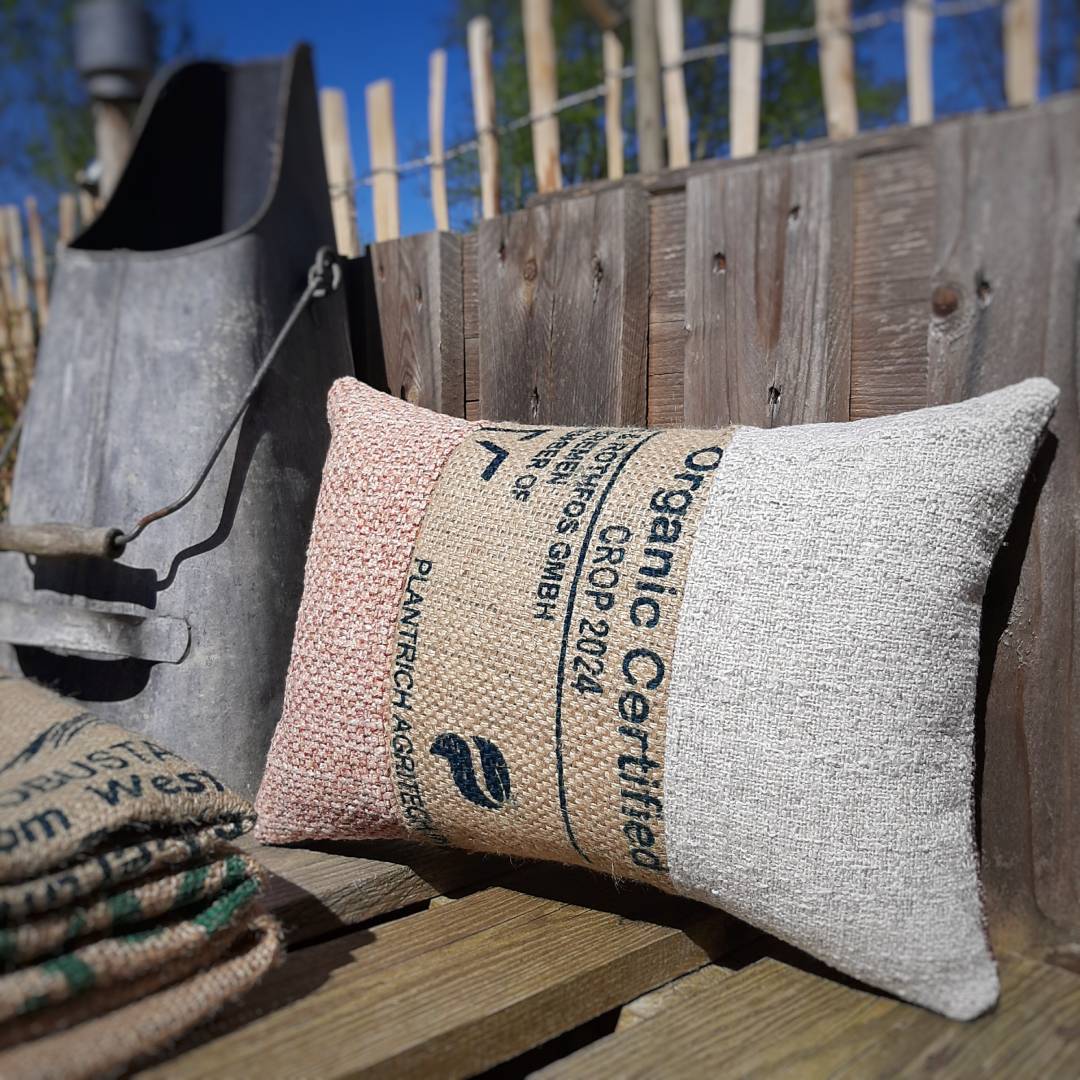 Dieses Upcycling-Kissen wurde in liebevoller Handarbeit aus ausgedienten Stoffmuster-Katalogen renommierter Möbelhäuser und Kaffeesäcken lokaler Röstereien hergestellt. Eine schöne Kombination aus feinen Möbelstoffen und robusten Jutesäcken, die schon die halbe Welt gesehen haben.