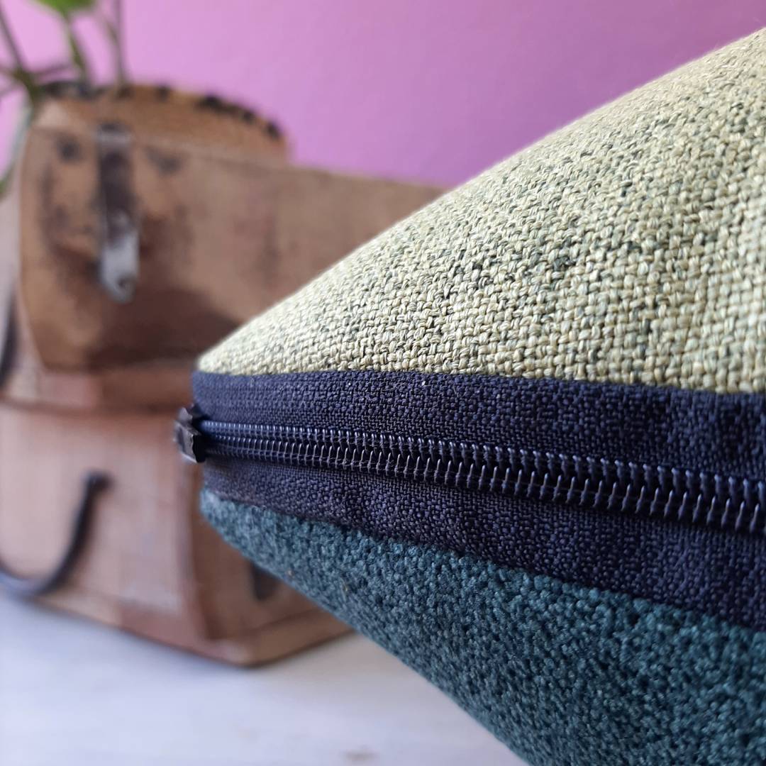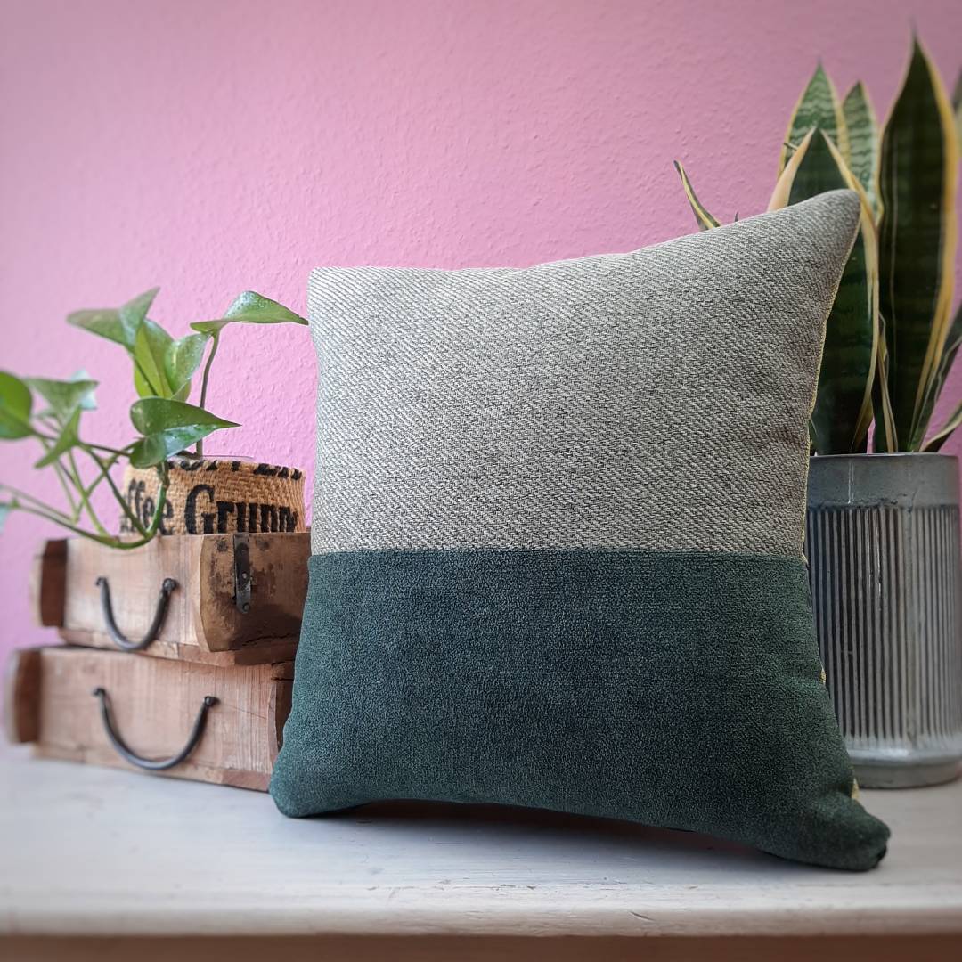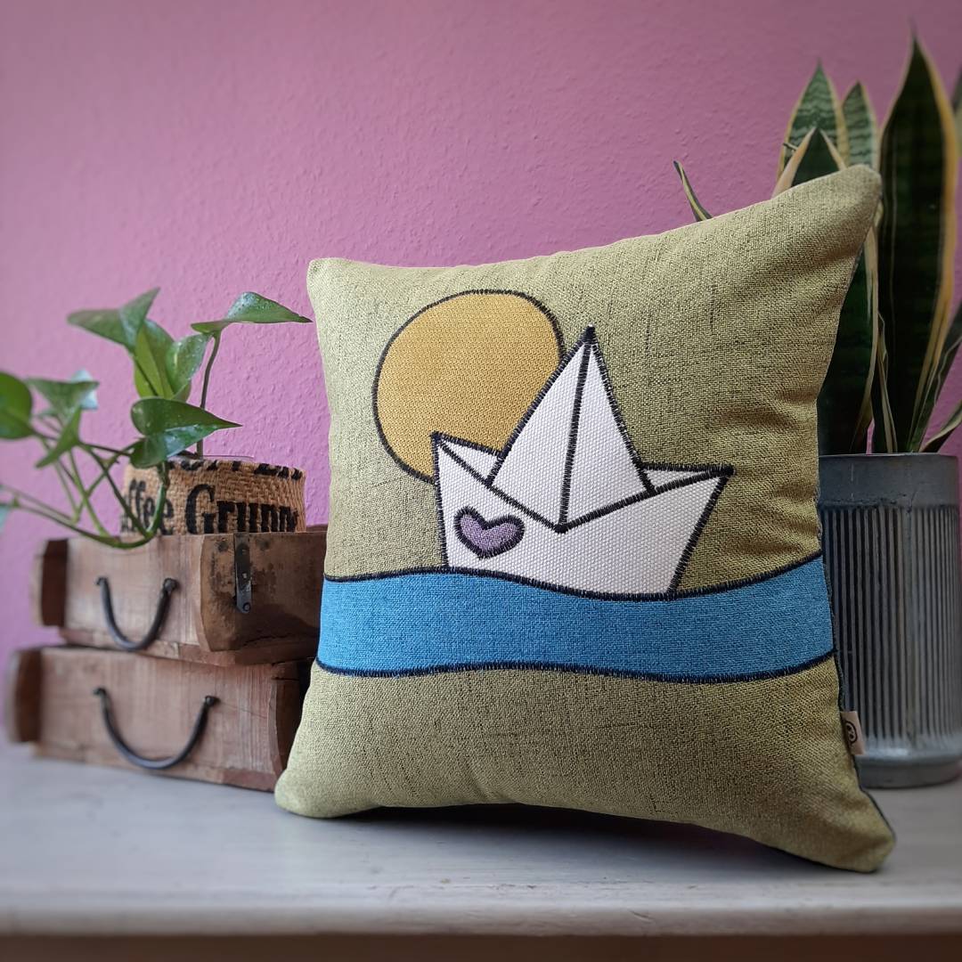 Dieses handgemachte Upcycling-Kissen aus ausgedienten Stoffmuster-Katalogen renommierter Möbelhäuser schippert inklusive Füllung zu Dir!